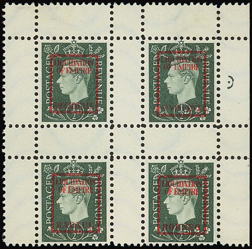 Borneo, Bougainville, Rabaul and St. Vincent in ½d. corner block of four, fine unused. A scarce multiple. PhotoF