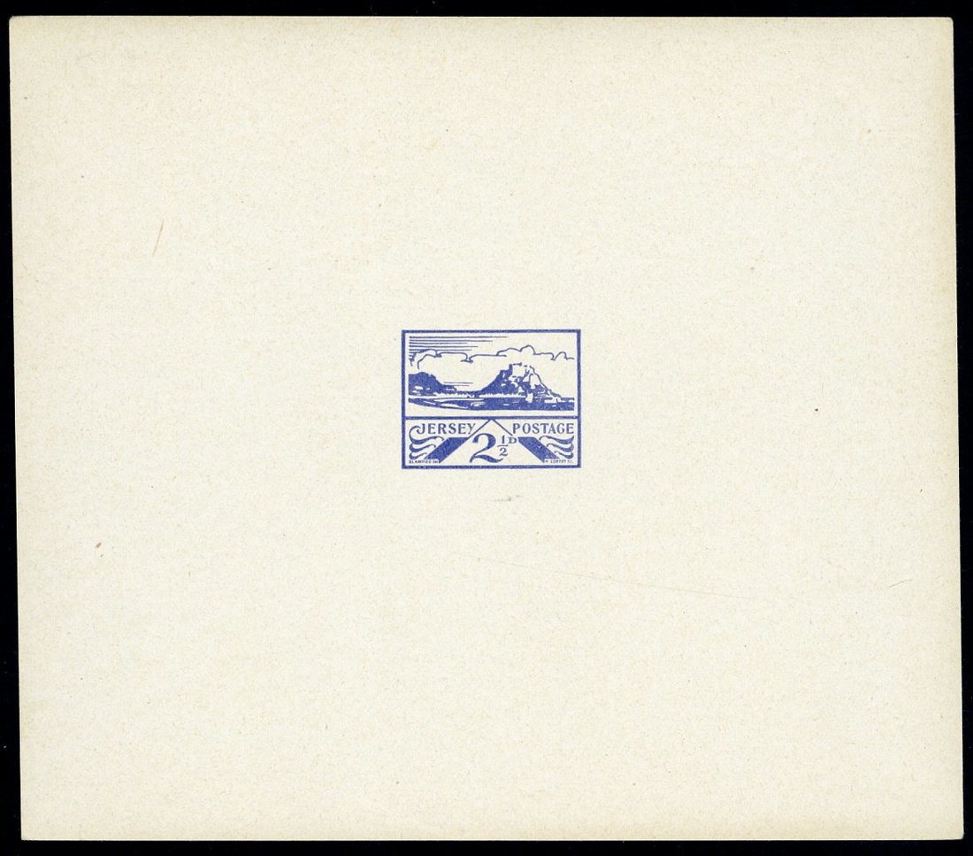 ½d. maroon, 1d. maroon and 2½d. blue die proofs on fine quality wove paper (142-144x111-125mm.), and 1½d. brown and 2d. orange die proofs on rough paper (104-110x65x67mm.)