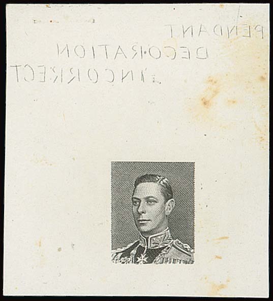 Young head facing half right with rectangular background, in black on wove paper (44x49mm., minor tone clear of the design) with "pendant decoration incorrect" engraved in reverse at top, and a similar portrait though showing less of the medals at foot, etc., in black on wove paper (27x34mm.). Photo