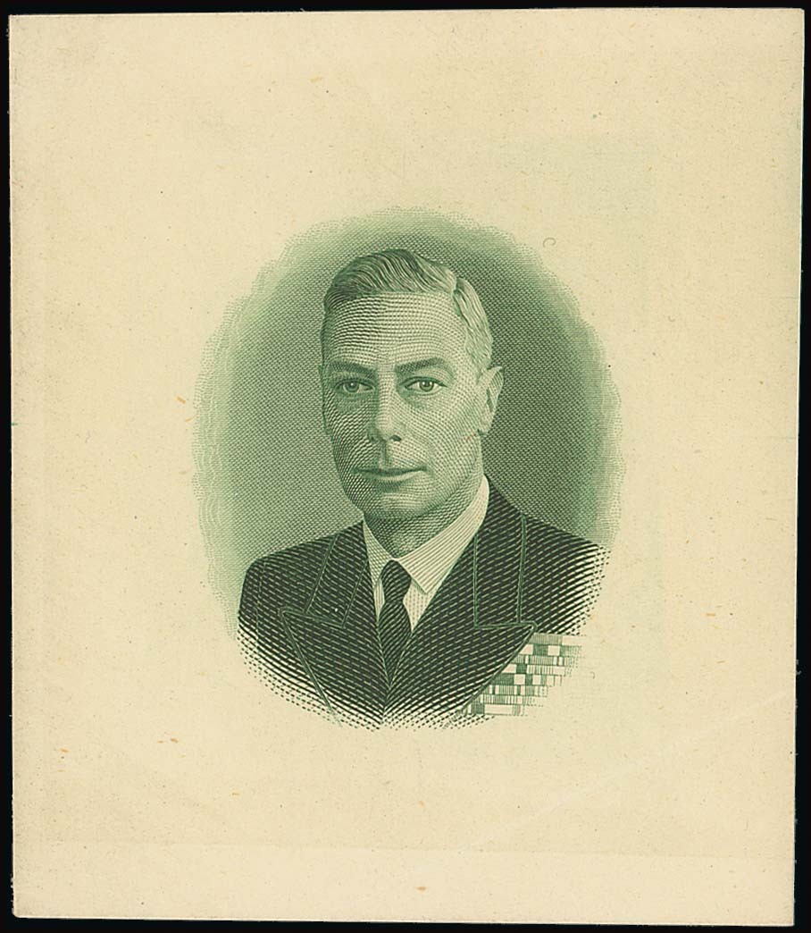 1950 (c.) portrait with oval background, three examples in large "banknote" format in violet, black and green on wove paper (74-77x82-86mm.), and similar portrait of head only in black on wove paper (77x85mm.) with part die number at top. An attractive quartet. Photo