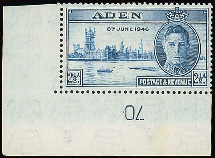 1946 Victory 2½a. blue, a lower left corner example with plate number, variety watermark inverted, mounted in selvedge only, crease in left margin, fine. Very rare. S.G. 29w, £1,800. Photo