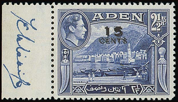 1951 (Oct.) 15c. on 2½a. deep ultramarine with margin at left, variety surcharge double, signature in margin, fine mint. B.P.A. Certificate (1968). S.G. 38a, £1,600. Photo
