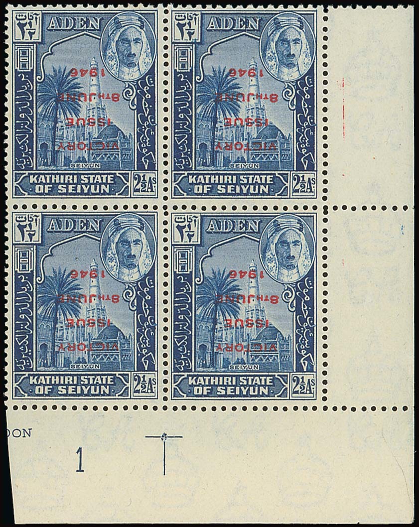 1946 Victory 2½a. lower right corner block of four with plate number, variety overprint inverted, fine unmounted mint. A unique positional piece, only one sheet of sixty existed. R.P.S. Certificate (1983). S.G. 13b, £7,200+. Photo