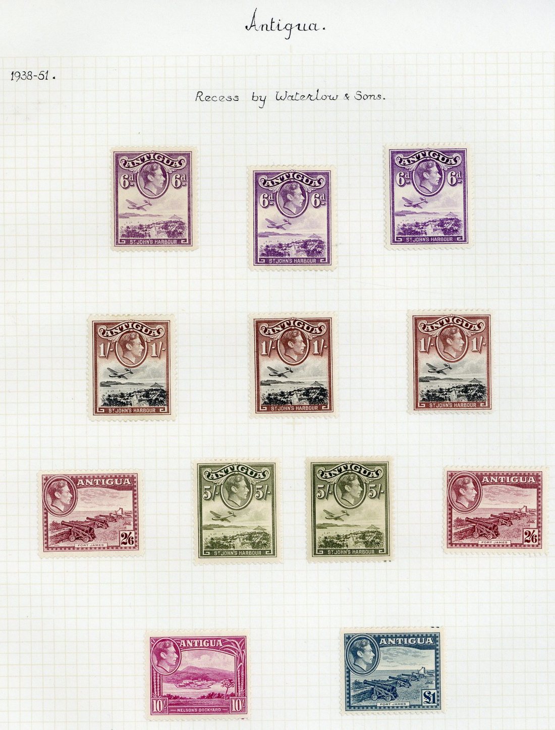 1938-51 ½d. (30), 1d. (24), 1½d. (27), 2d. (18), 2½d. (179 with a complete sheet, forty-two lightly toned), 3d. (56, many lightly toned), 6d. (15), 1/- (11), 2/6d. (9), 5/- (8), 10/- (5 including a lower right corner block of four with plate number) and £1 (5 including a lower right corner block of four with plate number), mostly in blocks of four, largely fine mint. S.G. 98-109, £1,590+