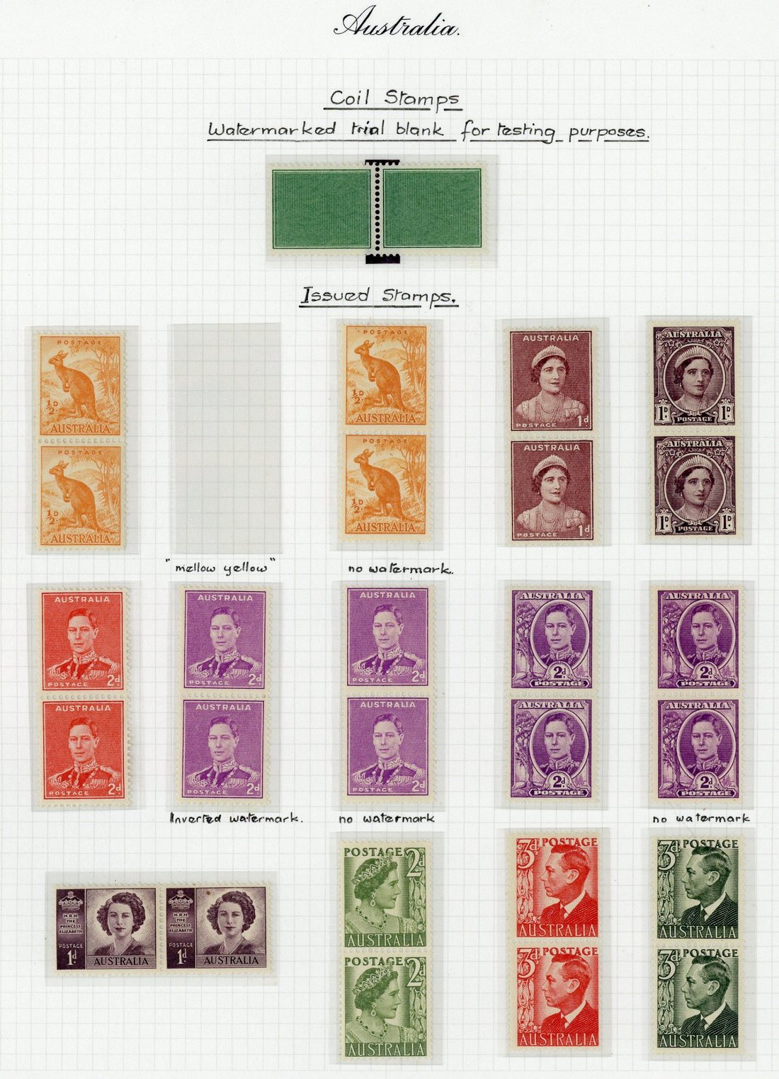 1937-51 mint collection of coil pairs including 1937-49 perf 15x14 ½d., 1d. maroon, 2d. scarlet (one shortish perf at foot) and 2d. bright purple (2, one with watermark inverted) and 1942-50 1d. and 2d., coil strips of four with joins including 1937-49 perf 15x14 ½d., 1d. maroon and 2d. bright purple, and 1942-50 1d. and 2d., coil strips with starter comprising 1943-50 1d. and 2d., and coil corner imprint blocks of four comprising 1950 no watermark ½d., 1952 Princess 1d. and 1952 2d.; fine. Cat. £1,700+