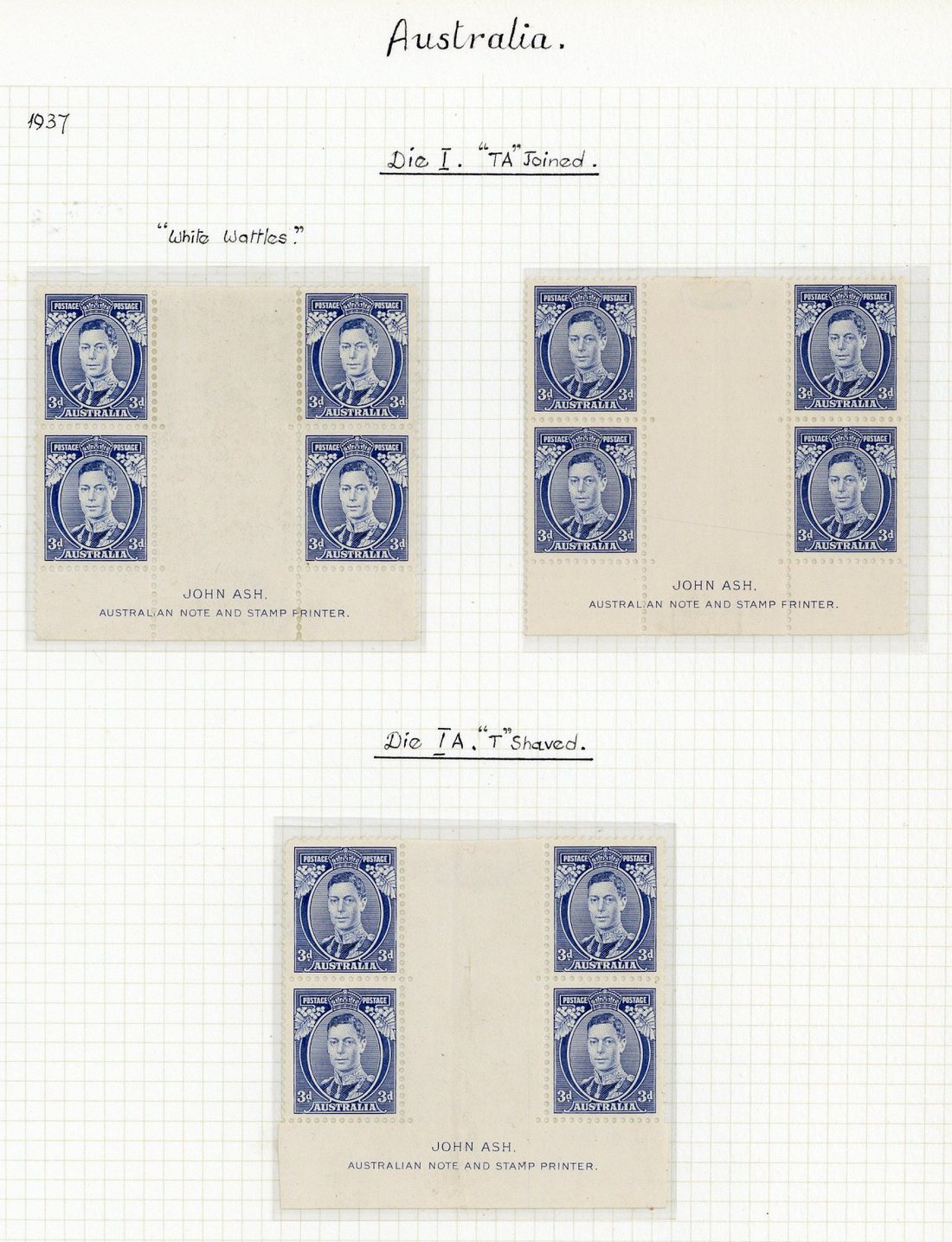 3d. blue, perf 13½x14, Die I Ash imprint interpanneau blocks of eight, one with "white wattles" (some perfs re-inforced), Die Ia Ash imprint interpanneau block of eight, Die II chalk-surfaced and unsurfaced papers, Ash imprint corner blocks of four (two of both, one each with "white wattles") and 3d. blue perf 15x14 Ash imprint interpanneau block of eight, fine mint. BW 190-195, $4,325