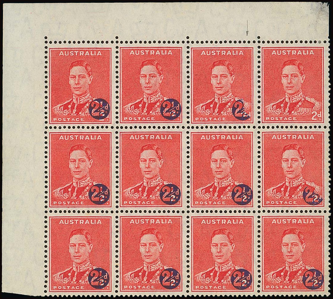 2½d. on 2d. scarlet, a top left corner block of twelve (4x3), the top right stamp with surcharge omitted and two others with surcharge partially omitted, fine mint. One of two known and one of the great Australian rarities from the King George VI period. S.G. 200a, £14,000; BW 222cb, $25,000. Photo