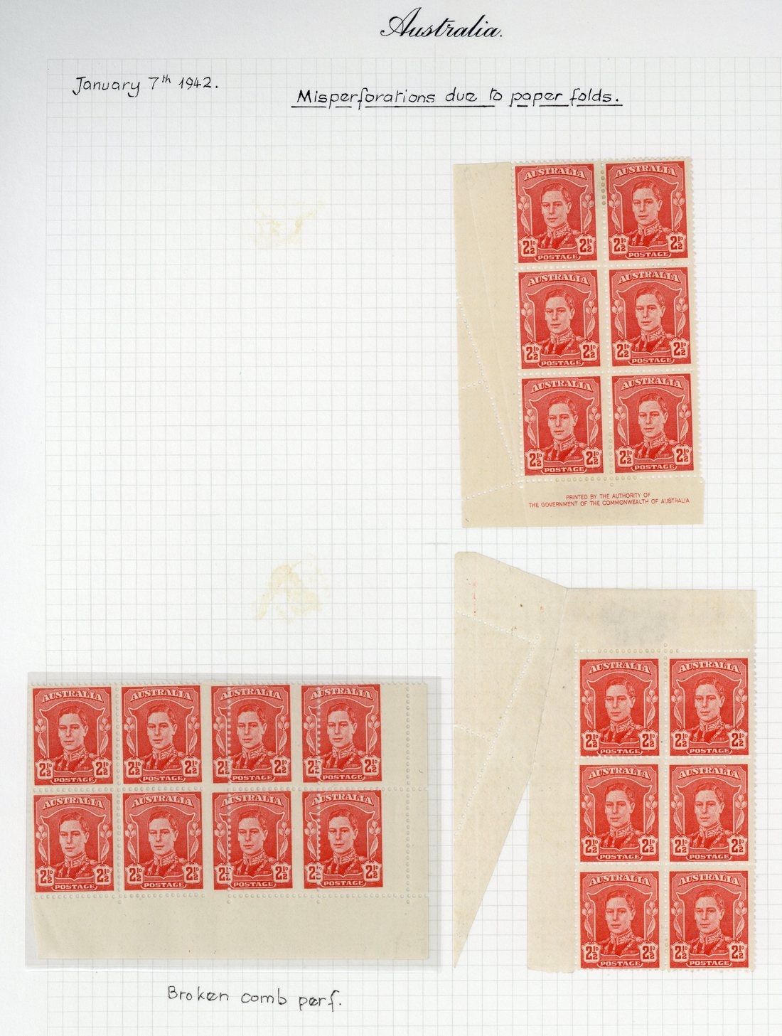 2½d. scarlet, an interpanneau block of eighty being the bottom five rows of a sheet, the left imprint virtually missing due to stripping, a lower right corner block of eight (4x2), the right block of four showing broken comb perf, a lower left corner block of six and a top left corner block of six with By Authority imprint (both 2x3) showing misperforations due to paper folds, three horizontal pairs, two imperforate and one with the right stamp imperforate, and a lower left corner block of ten (2x5) with By Authority imprint, the left column showing perforations double horizontally and at left; fine mint. BW 230