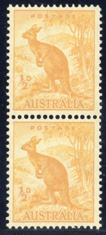 ½d. dull orange-yellow (so-called "mellow yellow"), a coil vertical pair, gum toned as are all examples, unmounted mint. Brusden White Certificate (undated). BW 180C, $400