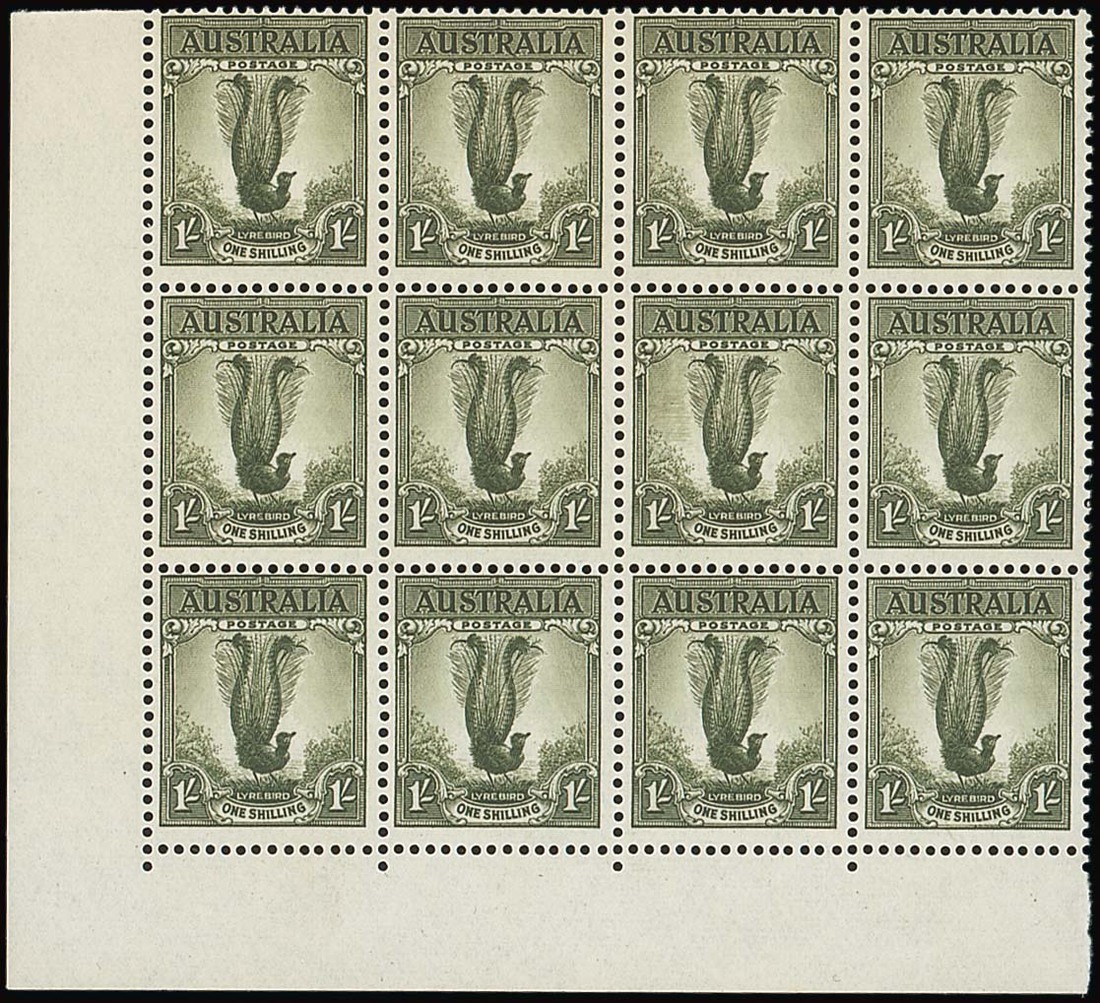 1/- grey-green lower left corner block of twelve (4x3), one showing "Green mist" retouch (R. L9/3), slightly toned otherwise fine unmounted mint. Rare. S.G. 230d/da, £4,000+; BW 210g, $5,000+. Photo