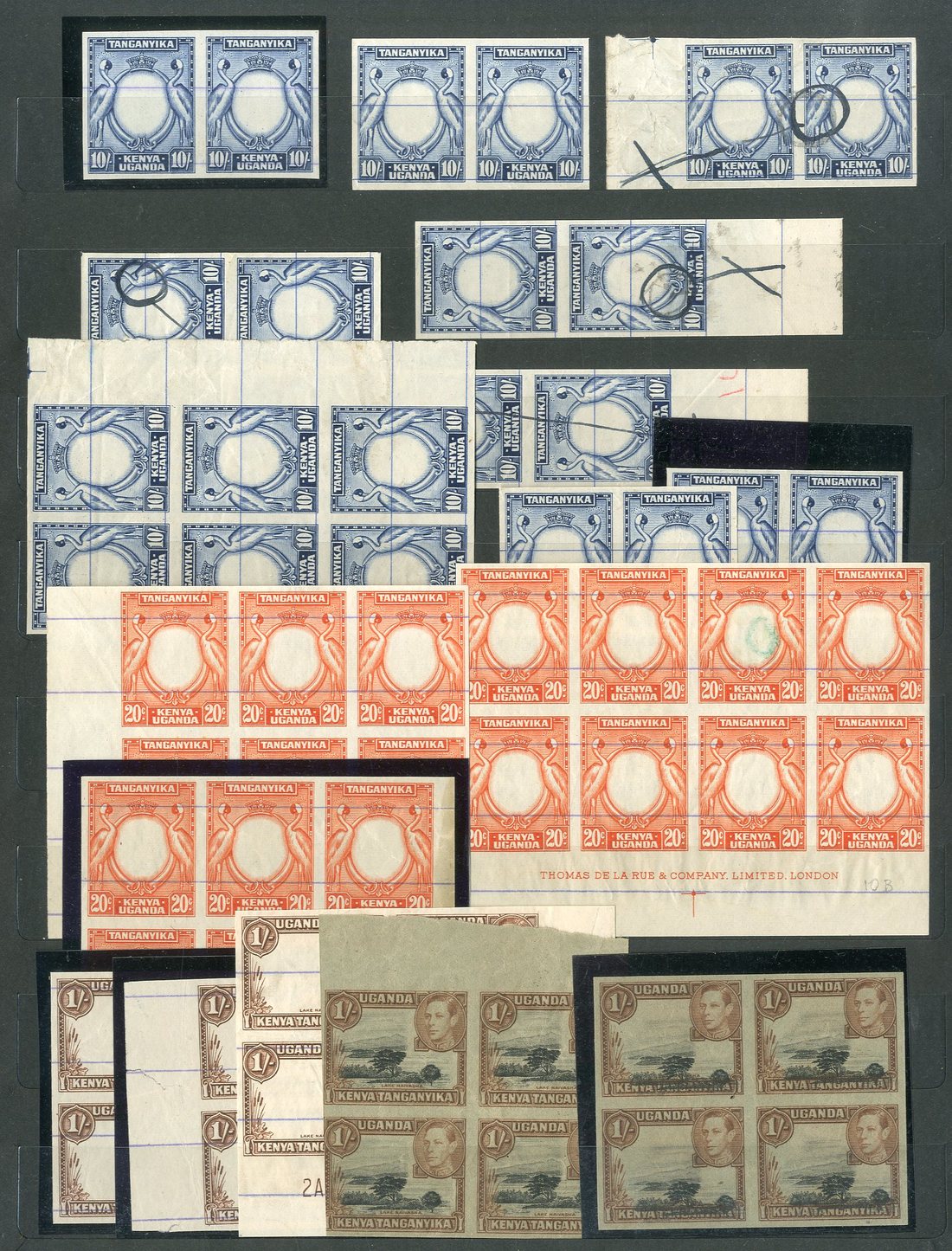 A range comprising a few pairs and blocks of four or larger, comprising 20c. frame (164 with a large part sheet of 144), 1/- frame (80 with a block of 68), 1/- complete on greenish grey paper (64) and 10/- frame (24, some with correction marks), all the frame proofs with ruled lines