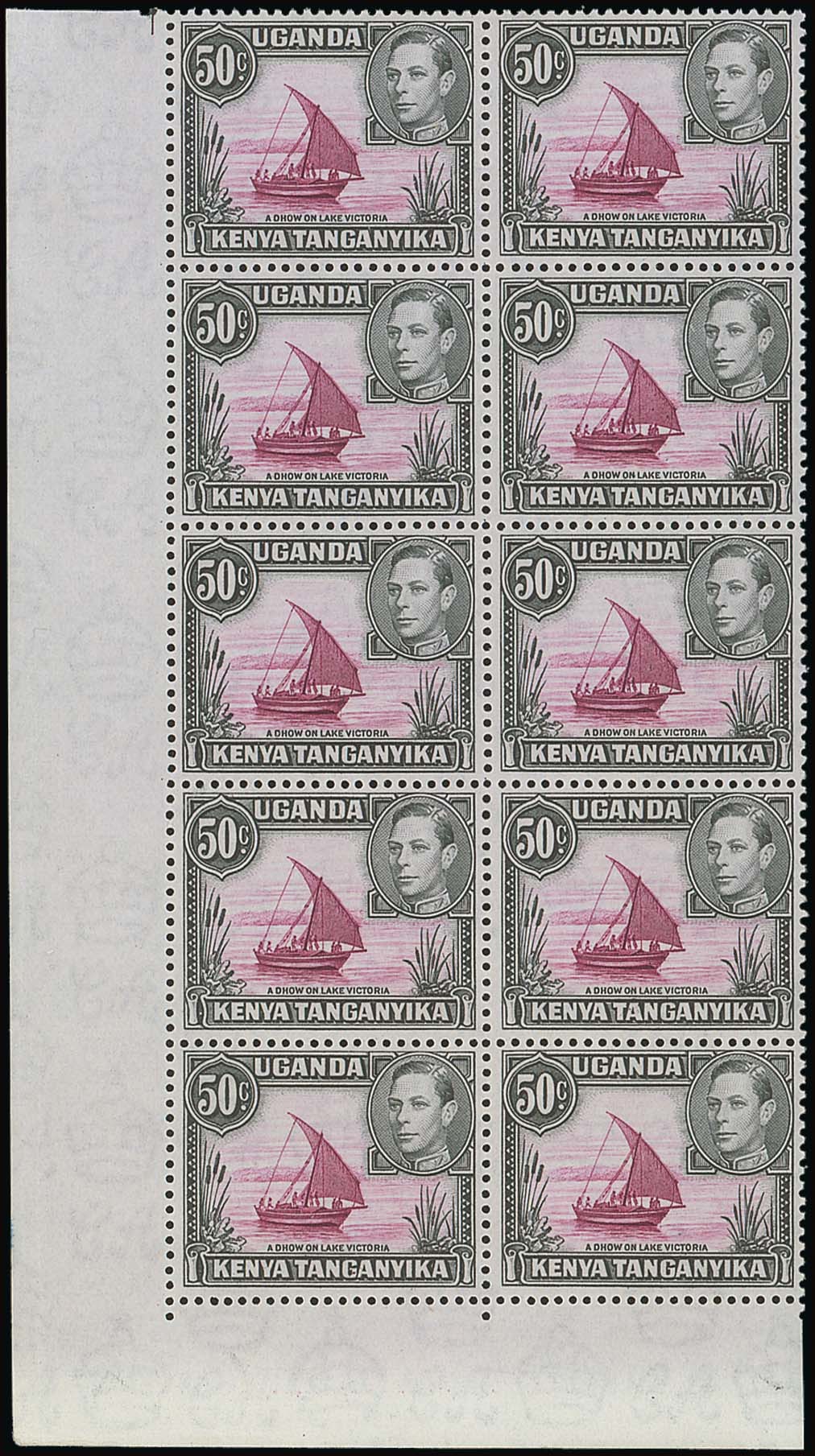 50c. reddish purple and black perf. 13x12½ dot removed lower right corner block of ten (2x5), Row 6/1-2, 7/1-2 and 9/1-2 all variety dot removed in pair with normal, fine unmounted mint; a rare multiple showing four of the five known positions of this variety. Also a pair from the foot of the sheet, both with dot and an unmounted mint single with extended mast. S.G. 145ea/eb, £2,000. Photo