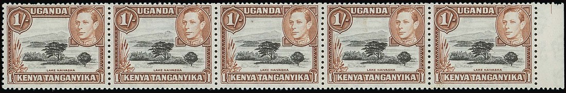 1/- black and brown, perf. 13x11¾ marginal strip of five, Row 6/7 variety mountain retouch and offered with a companion 10c. strip, fresh mint; one 10c. stamp thinned, both varieties unmounted. S.G. 145ac, 135a, £1,575. Photo