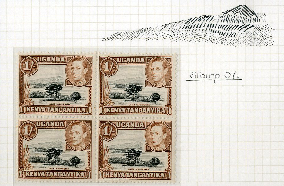 1/- black and brown, perf. 13x11¾ block of four, the upper left stamp Row 5/7 variety mountain retouch, mint with all stamps having hinge remainders; the variety with tiny inclusion and black mark on King's collar. Scarce. S.G. 145ac, £1,460+