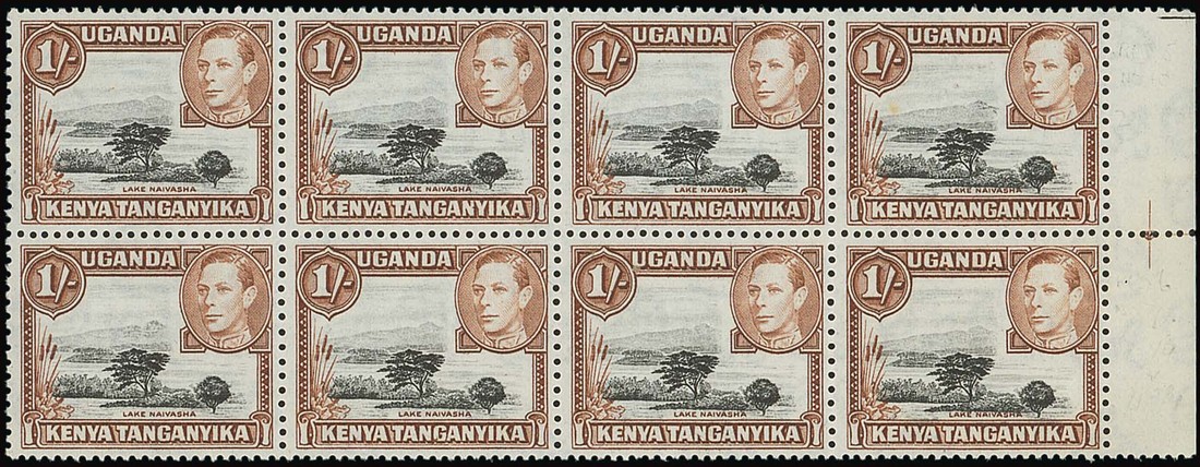 1/- black and brown, perf. 13x11¾ marginal block of eight (4x2), Row 5/10 variety mountain retouch, fresh mint with most unmounted, the variety with merest trace of a mount. An exceptional positional multiple of this rare stamp. S.G. 145ad, £3,390+. Photo