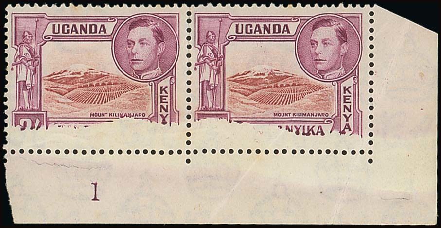2/- lake-brown and brown-purple perf. 13¼ Plate 1 lower right corner horizontal pair, portions of the foot of both stamps failing to print, mint with slightly off-white gum; diagonal crease across right-hand stamp and a few light tones confined to reverse. A most unusual printing variety. Photo
