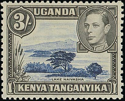 3/- deep violet-blue and black perf. 13x11¾, Row 6/7 variety damage on mountain, mint; toned though a presentable example of this rare stamp. S.G. 147ab, £5,500. Photo