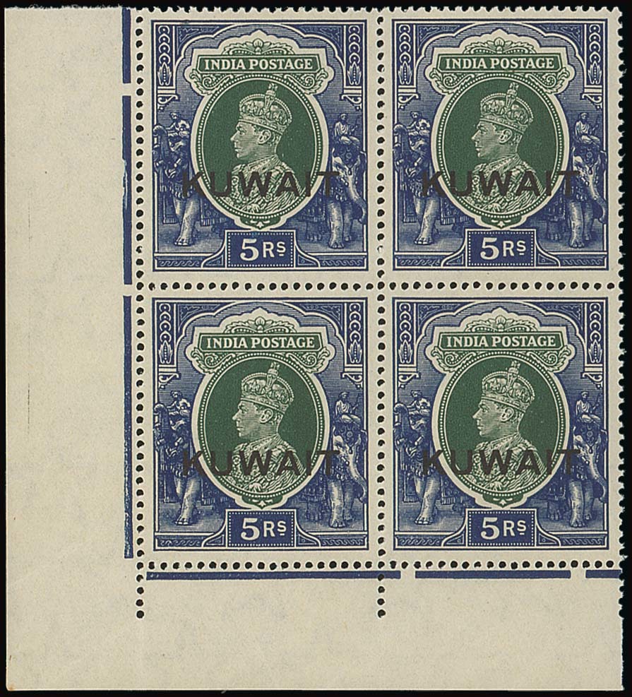 5r. green and blue, a lower left corner block of four, one showing variety extended "T" (2nd repair), very lightly toned, unmounted mint. B.P.A. Certificate (1978). Murray Payne 12b, unpriced. Photo