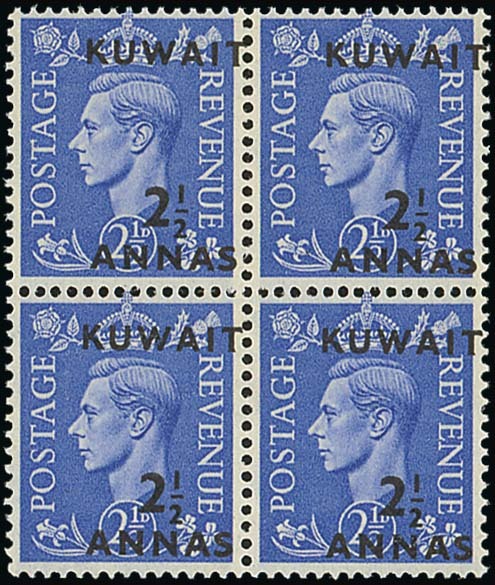 2½a. on 2½d. light ultramarine block of four, variety surcharge misplaced to right, fine unmounted mint. Stated only one sheet known - see Donaldson page 167. S.G. 68 var. Photo