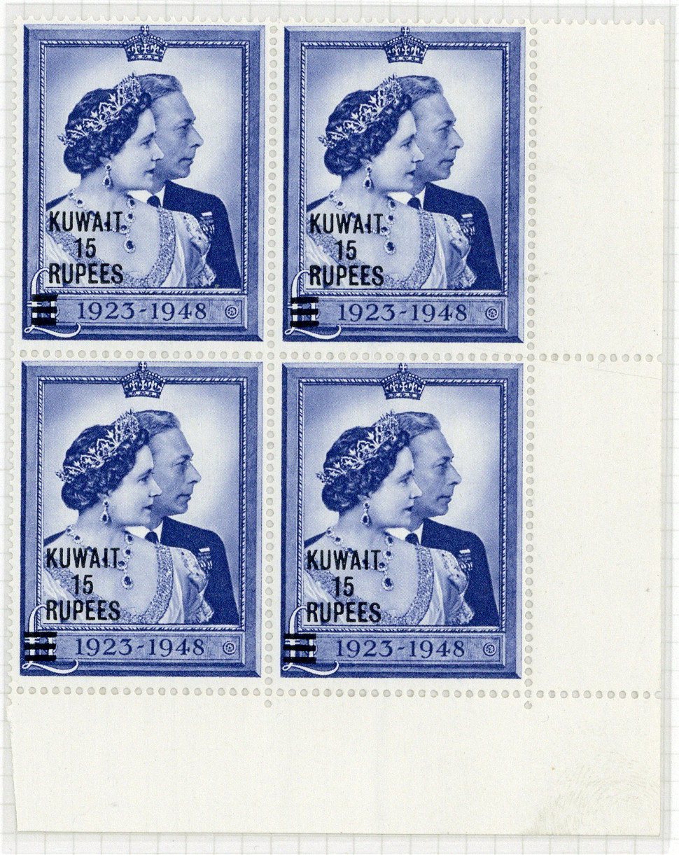1948 (May) Wedding 15r. on £1 blue, a lower right corner block of four with one showing variety short bars, very fine unmounted mint. S.G. 75/a, £364+