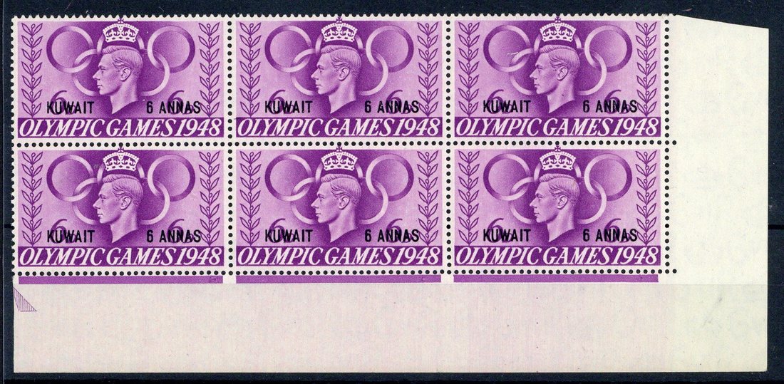 1948 (July) Olympic Games 6a. on 6d. bright purple, a lower right corner block of six (3x2), one showing "hlp" retouch, fine mint. Murray Payne S5a, £200