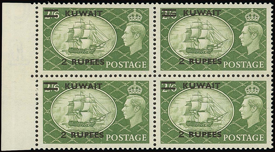 2r. on 2/6d. yellow-green block of four with margin at left, the upper right stamp showing variety extra bar in centre, and a lower right corner block of twelve (2x6) without the variety; fine mint. S.G. 90/a, £1,400+. Photo