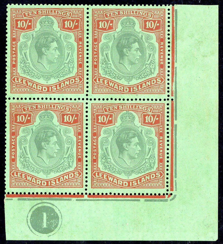10/- bluish green and red on green 1938 printing lower right corner plate block of four, [47a] not apparent, fresh mint; the upper pair with two tiny thin specks, otherwise fine. S.G. 113, £800+