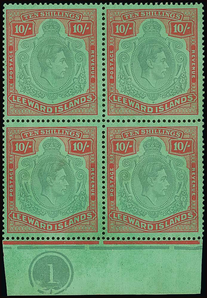 10/- pale green and pale red on green March 1942 printing marginal block of four, [47-60] with plate number, [59] broken top right scroll, [60] broken lower right scroll, unmounted mint; [59] with trace of a light mark on head. A very rare positional multiple with this variety. S.G. 113a/ad/ae, £17,700+. Photo