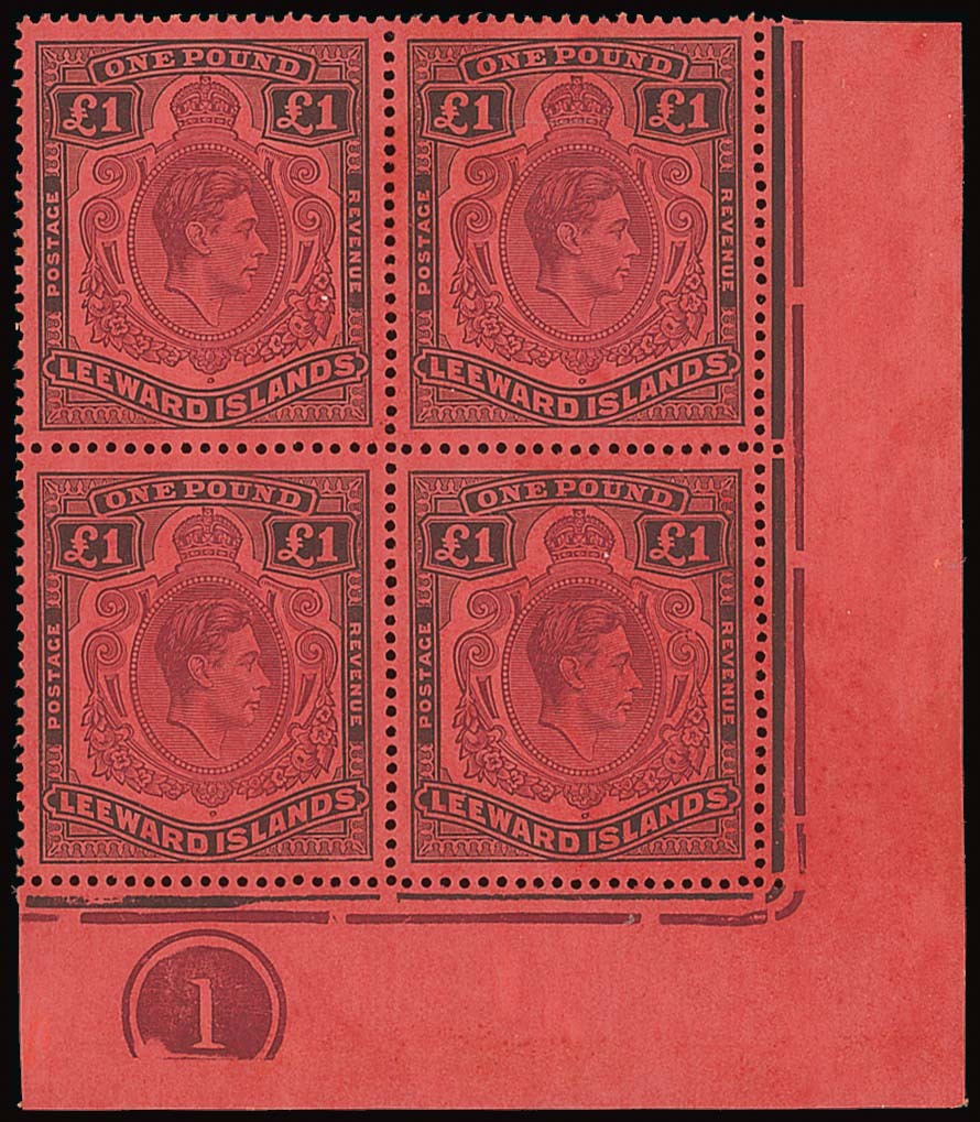 £1 purple and black on carmine 1942 printing lower right corner plate block of four, [59] damaged top right scroll and [60] broken lower right scroll, mint and mounted in margins only; colour a little pale, otherwise fine. A rare positional multiple. S.G. 114a/ae, £2,270+. Photo