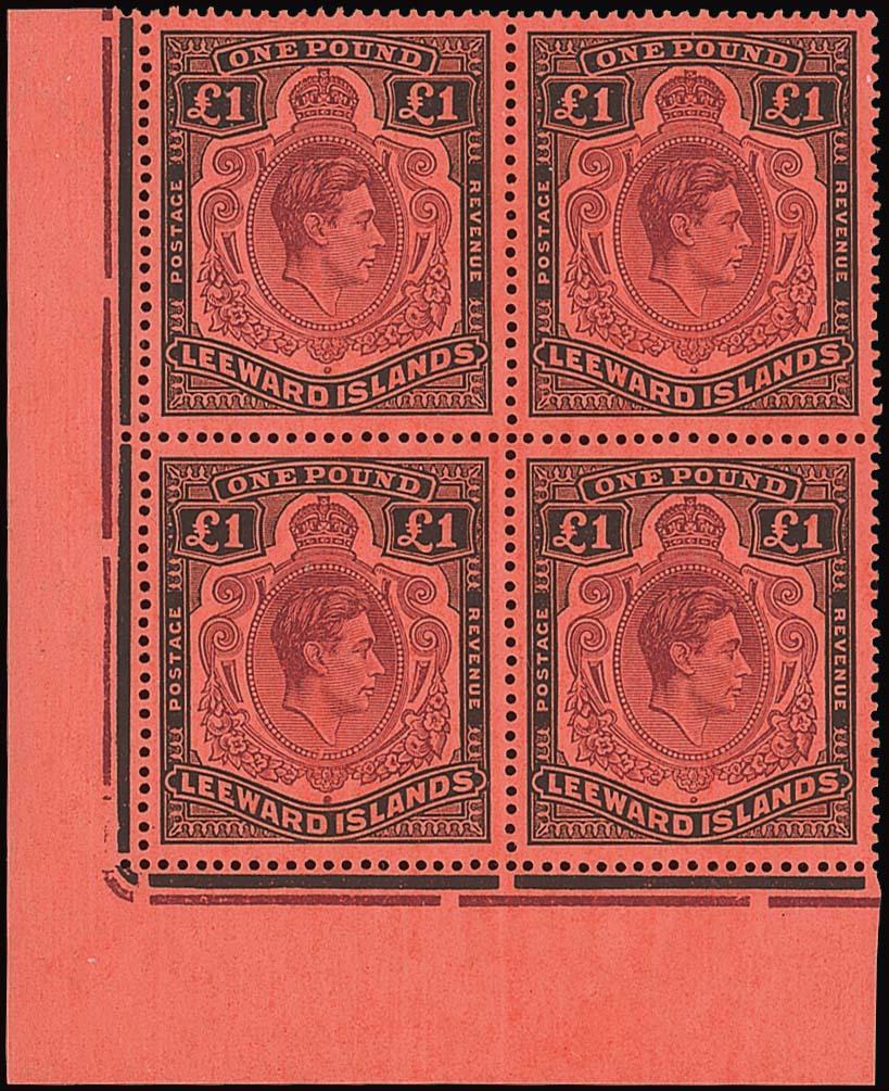 £1 deep red-purple and black on salmon June 1944 printing lower left corner plate block of four, [49] missing pearl, lightly mounted mint with the variety remaining unmounted; some gum creasing at foot and into the lower pair. A rare positional multiple. S.G. 114b/ba, £1,835+. Photo