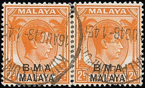 1945-48 2c. orange, Die II, a rejoined horizontal pair with watermark inverted, clearly cancelled by Kuala Lumpur c.d.s., fine. Very rare. S.G. 2w, £5,000. Photo