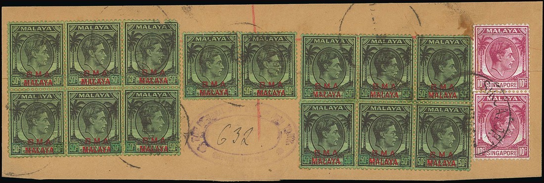 1948-48 50c. black on emerald made from the 1c., fourteen single examples affixed to piece to give the appearance of multiples, tied by indistinct Singapore datestamps to piece which also bears genuine Singapore 10c. vertical pair and shows oval cachet of National City Bank of New York, Singapore; a few missing perfs or minor scuffs, otherwise a fine and rare piece. Also a genuine used block of four and a 1c. for comparison. PhotoF