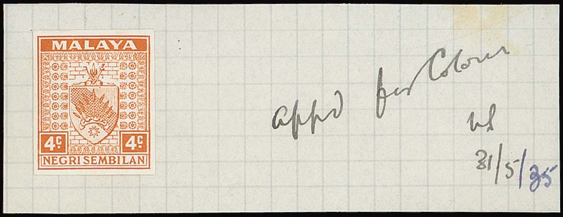 1935-41 4c. orange imperforate colour trial on piece (92x35mm.), marked "appd for colour", initialled and dated "31/5/35", fine. Photo