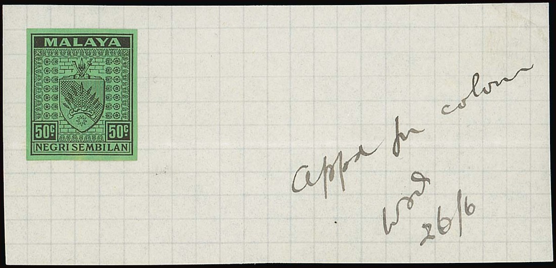 1935-41 50c. black on emerald imperforate colour trial affixed to piece (100x48mm.), marked "appd for colour", initialled and dated "26/6", fine. Photo