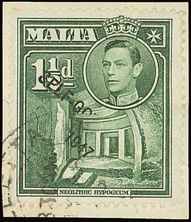 1½d. green, variety part albino overprint showing just "self-go/1947", neatly cancelled by part Valletta double-ring datestamp and tied on small piece. A very rare and unusual variety indicating the way that the albino overprint may have occurred. Photo