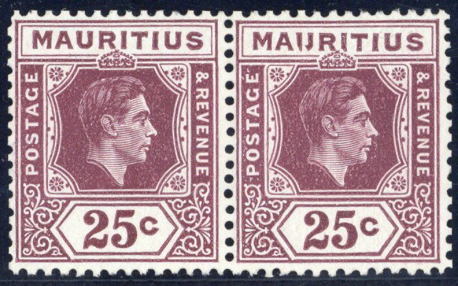 25c. brown-purple on ordinary paper, a horizontal pair with the right-hand stamp "u" flaw, fresh mint. S.G. 259ba, £300
