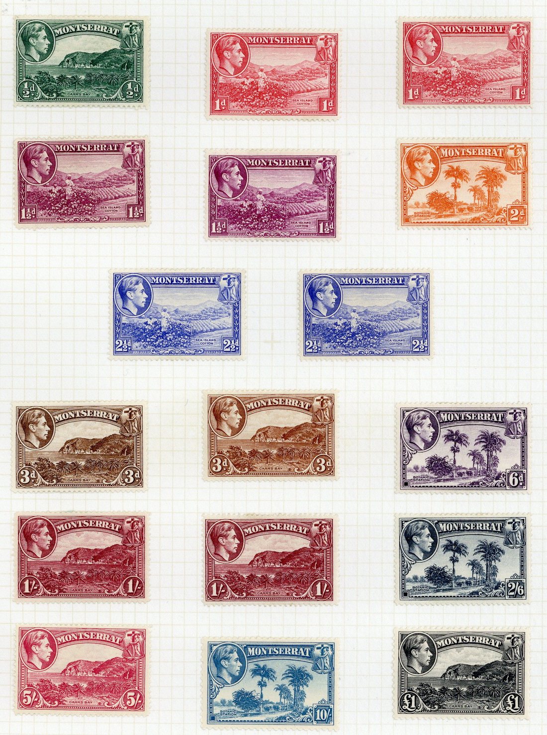 1938-48 perf 13 ½d. to 5/- (2 of each), perf 14 ½d. (32 including a top left corner block of perfs showing double perforations at left), 1d. (23), 1½d. (38), 2d. (24), 2½d. (21), 3d. (27), 6d. (20), 1/- (20), 2/6d. (6) and 5/- (6) with many in blocks of four (one 2/6d. and 5/- with plate number), and perf 12 10/- and £1; fine mint. S.G. 101-112, £1,100+