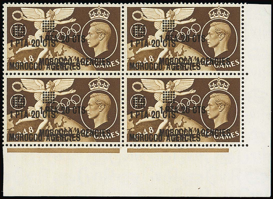 1948 (July) Olympic Games 1p.20c. on 1/- brown lower right corner block of four, variety surcharge double, fine unmounted mint. A rare multiple. B.P.A. Certificate (1974). S.G. 181a, £6,000+. Photo
