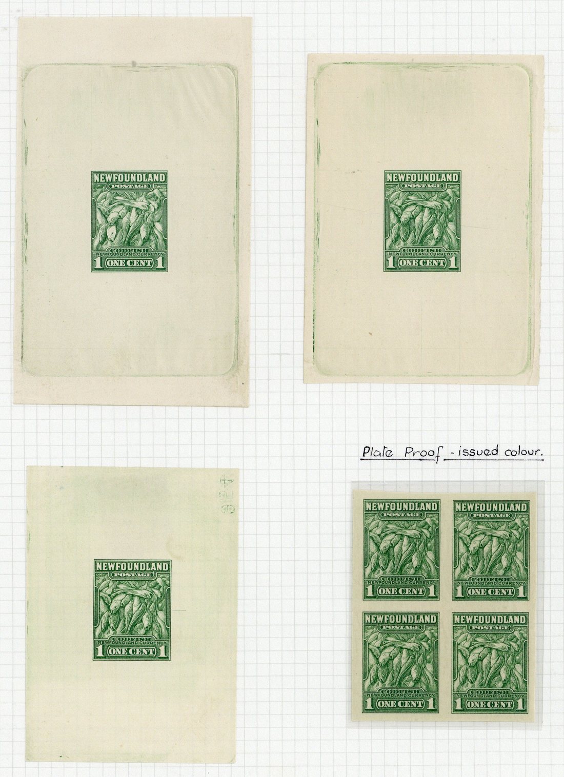 Two progressive die proofs in green on wove paper (62-63x87-103mm.), a third on watermarked wove paper (56x79mm.) showing die number, and an imperforate block of four on gummed watermarked paper