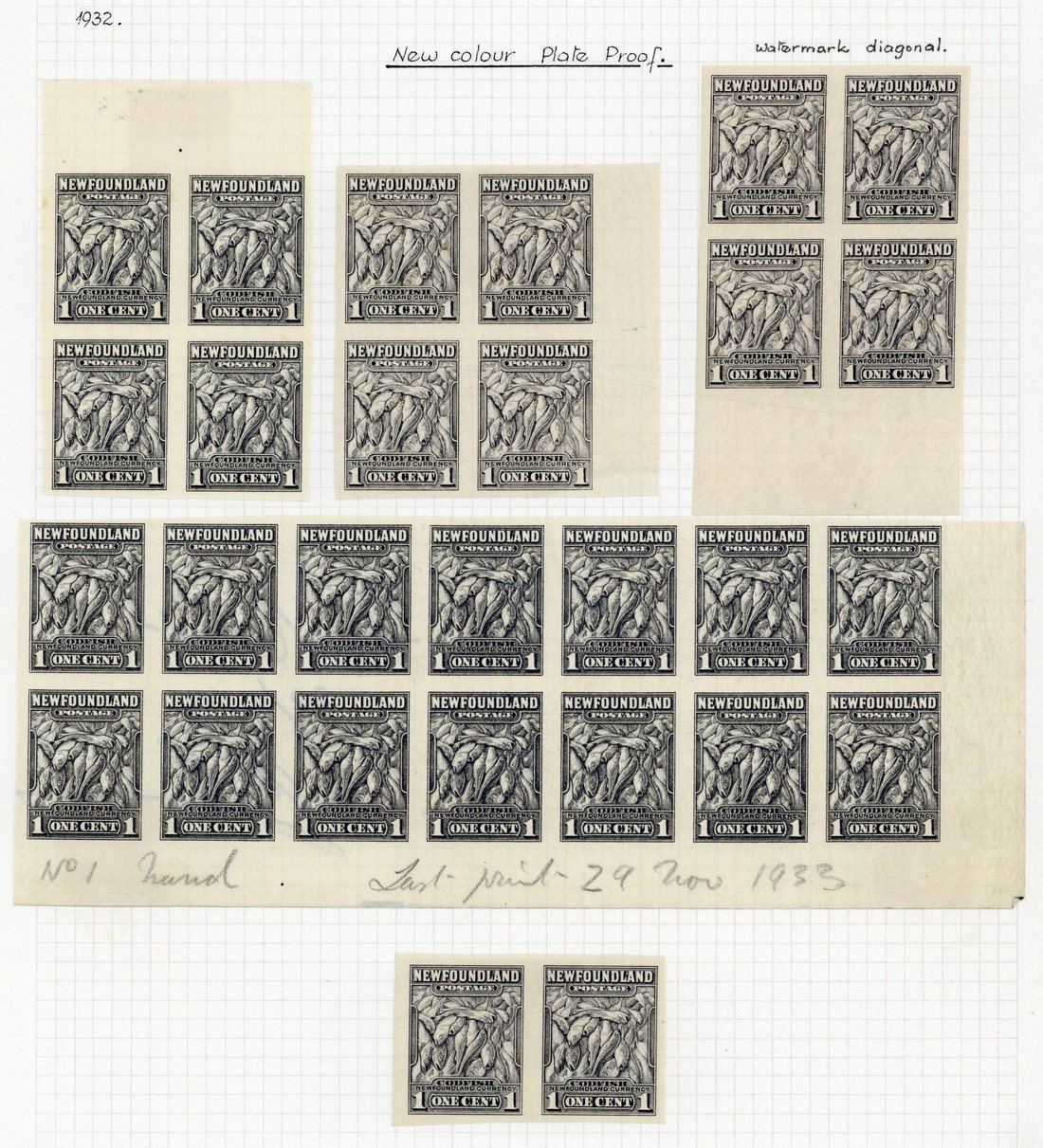 A selection of imperforate plate proofs in various shades, comprising a lower right corner block of fourteen (7x2) marked "Last print 24 Nov 1933" in pencil and a marginal block of four, both without gum, two marginal blocks of four (one with watermark diagonal) and a horizontal pair, mint; a fine group