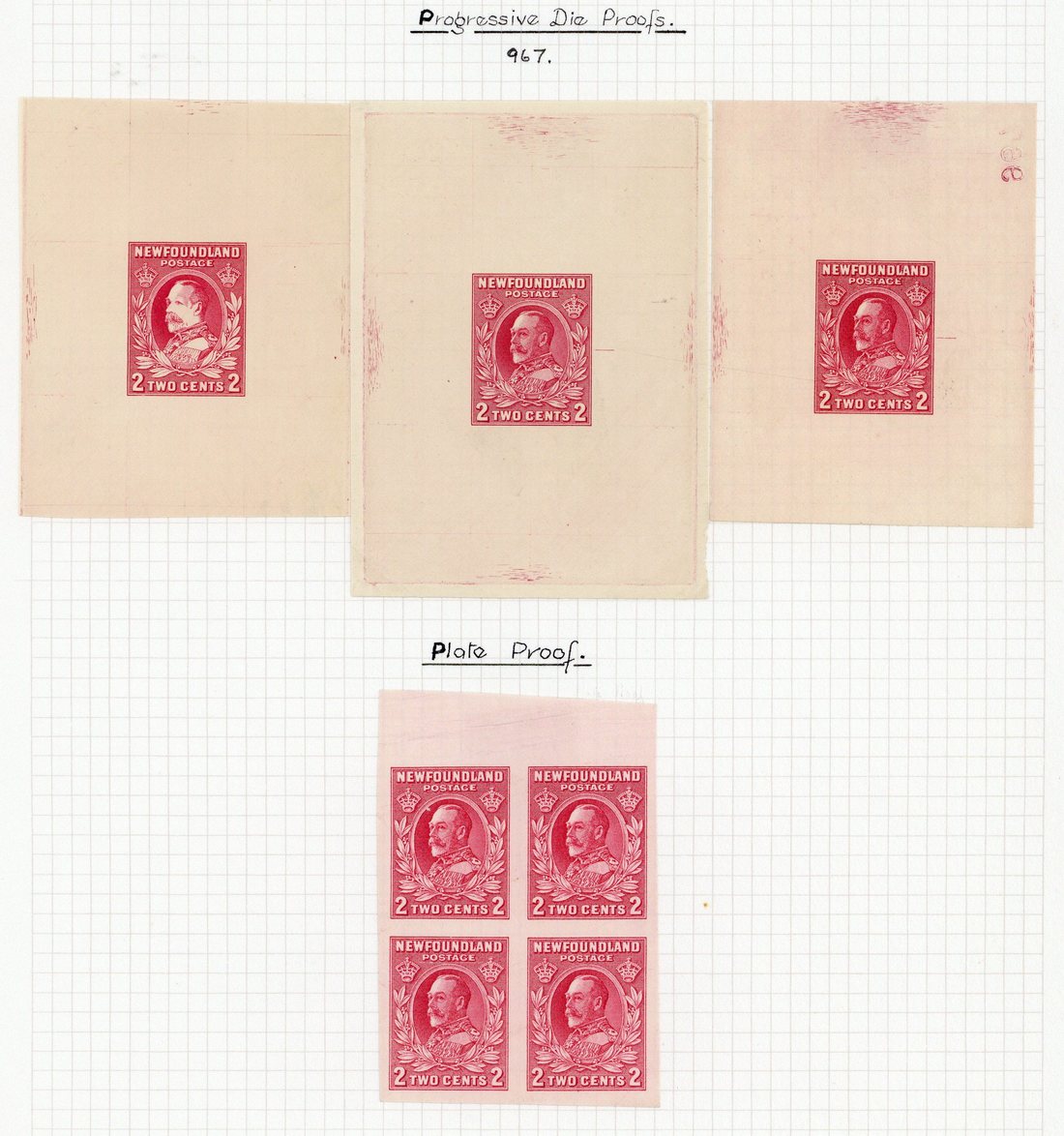 Two progressive die proofs in carmine on wove paper (58-61x73-87mm.) and one on watermarked paper (56x73mm. showing die number), and a marginal imperforate block of four (some diagonal creasing) on ungummed watermarked paper