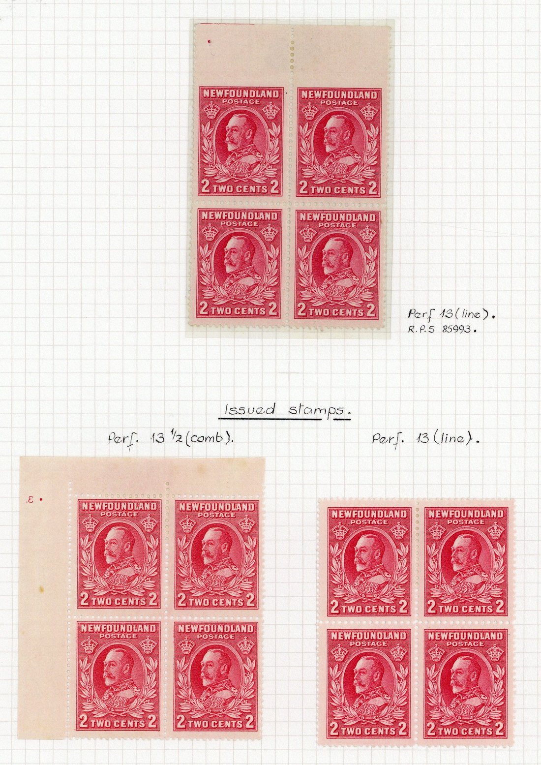 A selection of the issued stamps with perf. 13½ comb Plate 3 and perf. 13½ line blocks of four, and Booklet printing blocks of four (5) comprising perf. 13 (2, one with double perfs. at top and one with triple horizontal perfs. at centre), perf. 13 line (2, one imperforate between stamps and margin) and perf. 13½ comb, fine mint