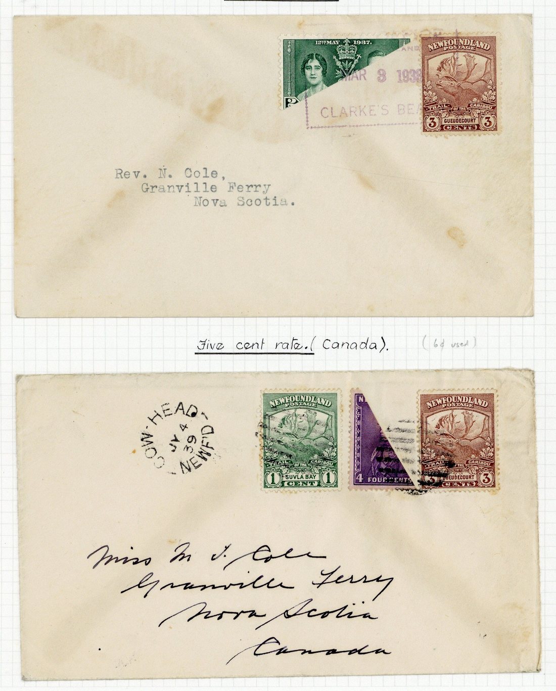 1937 envelopes (2) bearing 2c. green from Curling and officially authorised for local delivery of Christmas cards, and four others bearing 1929 2c., 1932 4c. violet, 1937 Coronation 2c. and 1938 4c., with others values, used from Bonavista, Clarke's Beach, Cow Head and Victoria