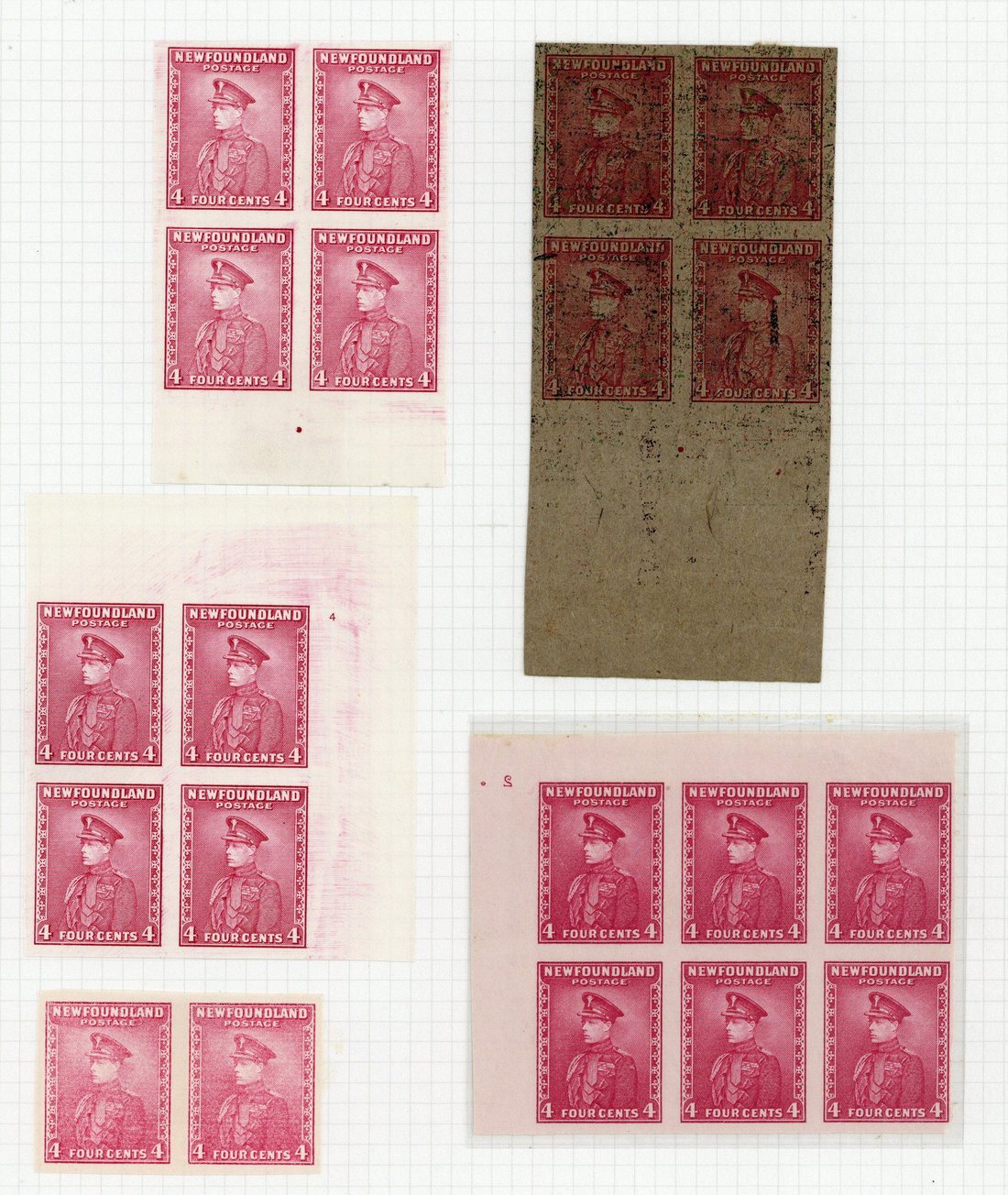 A selection of imperforate plate proofs, comprising a Plate 2 corner block of six on gummed paper, a horizontal pair, marginal and corner blocks of four in light carmine, and a marginal block of four on coarse brown paper with part black paper overlays, all ungummed