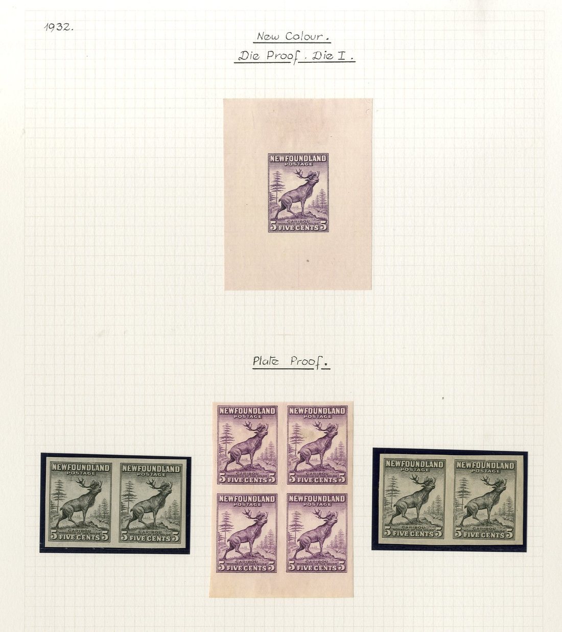 Die proof in violet on watermarked paper (50x65mm.), imperforate plate proof in maroon, two pairs in black and a block of four in violet, and issued stamps in maroon (2) and violet (3) blocks of four, and violet single with watermark sideways; fine
