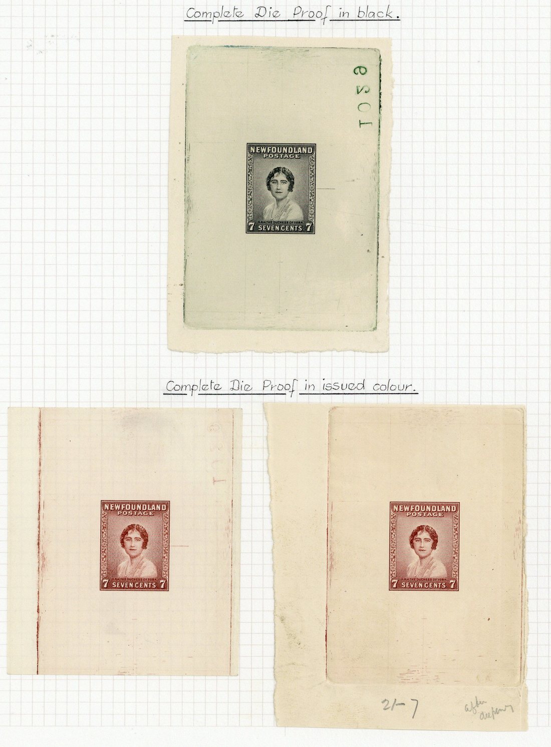 Die proofs (3), one in black on wove paper (65x93mm.) showing complete die impression and die number, one in red-brown on wove paper (75x97mm.) marked "After deepening" and one on watermarked paper (69x79mm.) showing centre guide mark at right and die number; imperforate plate proof block of four and two issued blocks of four