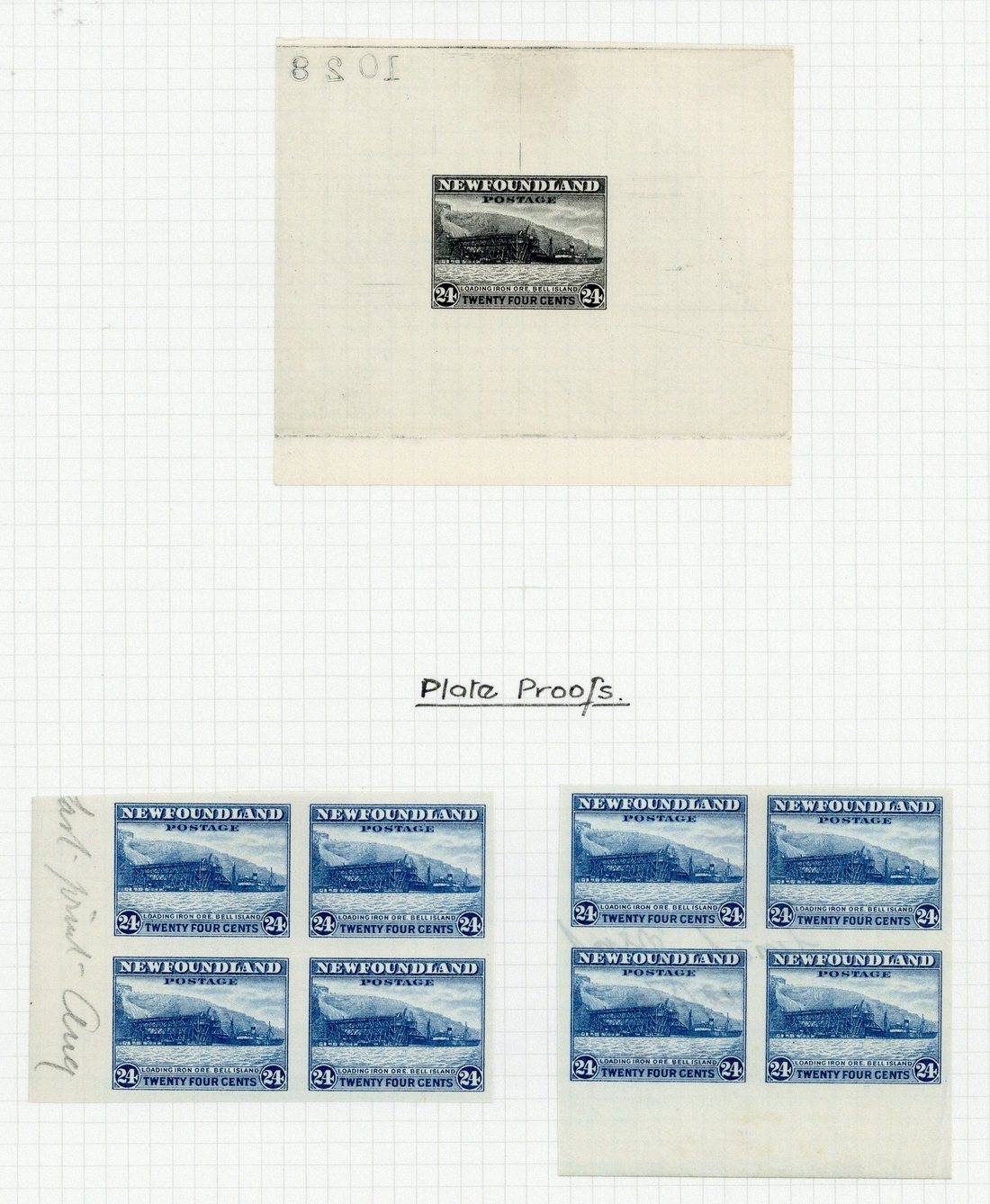 Die proof in black on watermarked paper (78x5698mm.) showing die number; two imperforate plate proof blocks of four in bright blue and issued stamps, perf. 13½ comb mint blocks of four (2) in contrasting shades