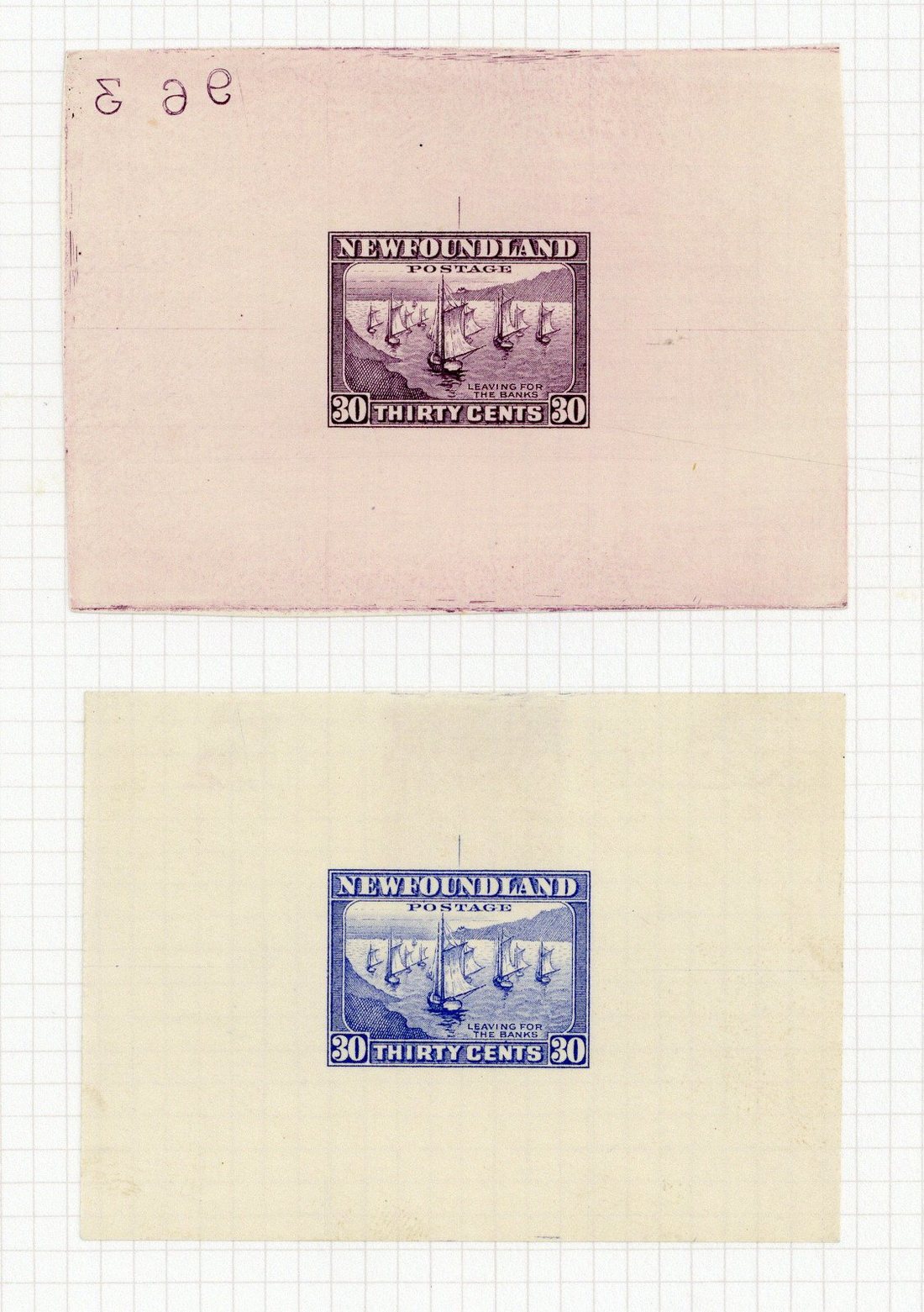 Die proofs in violet on wove paper (80-58mm.) showing guide line at top and die number, and a further proof in ultramarine on watermarked paper (78x56mm.) showing guide line at top; also issued stamp perf. 13½ mint block of four. An attractive pair