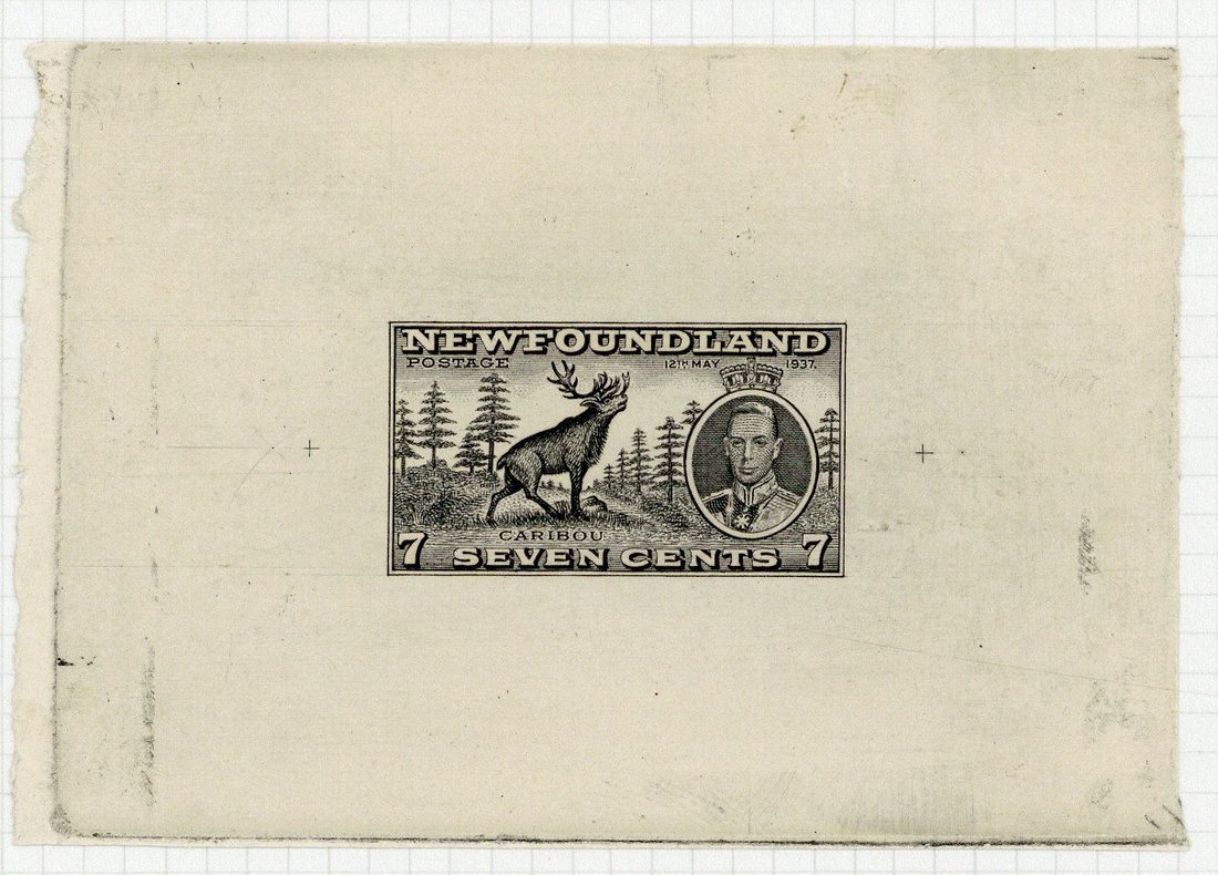 7c. Caribou progressive types (5) in ultramarine with two showing the vignette and head and one in final state with guide crosses removed, and one in black in final state, on wove paper (95-97x63-70mm.) with most showing complete die impression