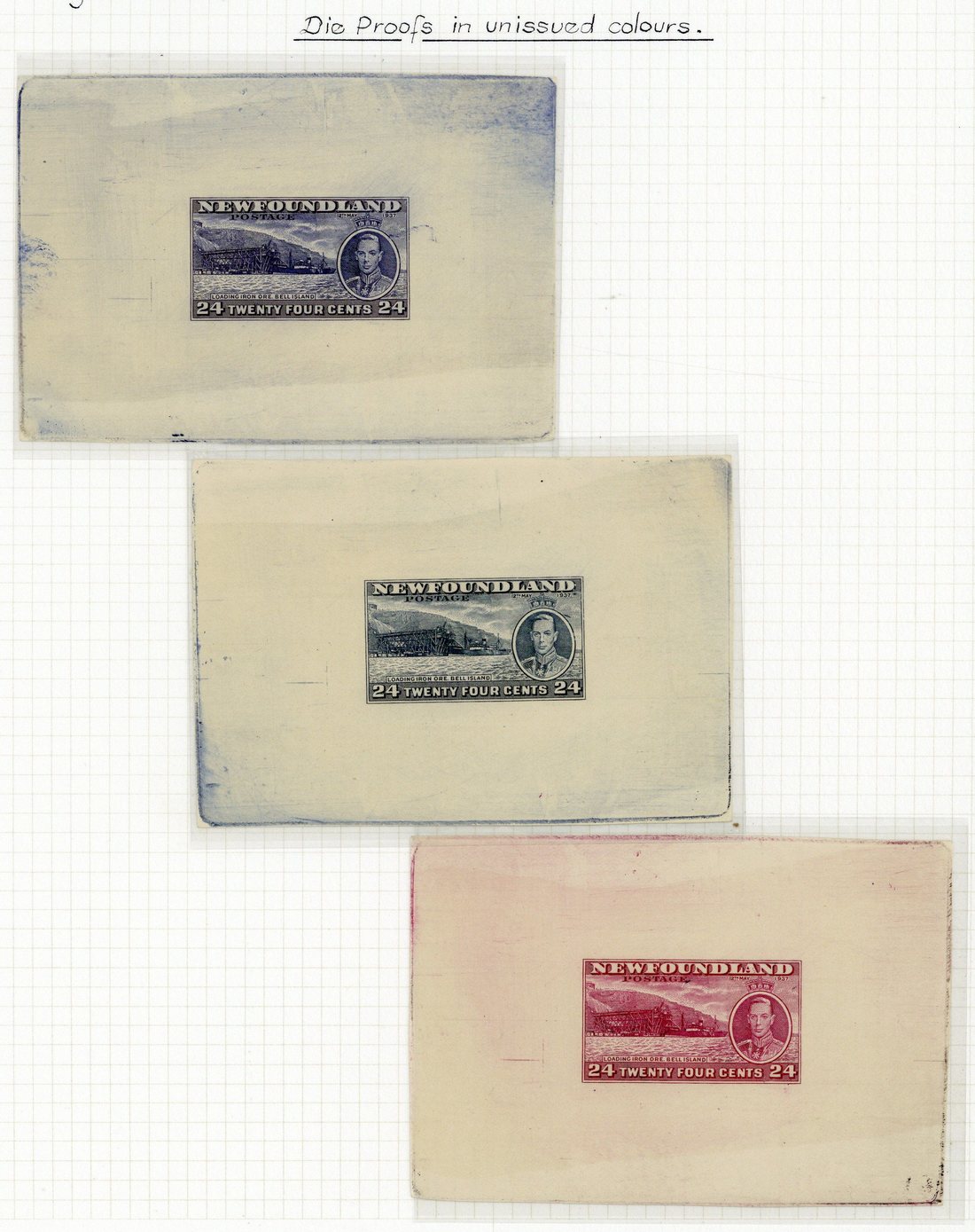 24c. Bell Island (3) in indigo-blue, deep blue and claret, all on wove paper (94x65mm.) showing complete die impressions. A most unusual trio in unissued colours